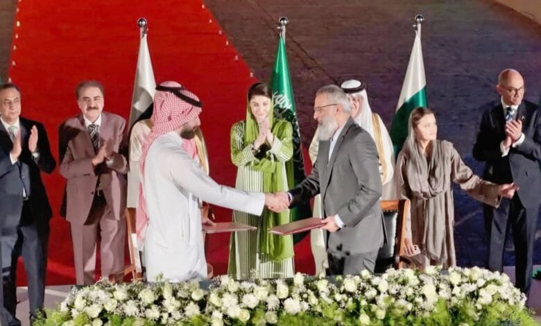لاہور: پنجاب میں معاشی ترقی کے دروازے کھلنے لگے، جب پاک سعودی جوائنٹ بزنس کونسل کے اعلیٰ سطحی وفد نے صوبے کا دورہ کیا اور مختلف شعبوں میں اربوں ڈالر کی سرمایہ کاری پر آمادگی ظاہر کی۔ اس موقع پر بادشاہی مسجد کے تاریخی عالمگیری دروازے کے سامنے ایک پروقار تقریب کا انعقاد کیا گیا، جس میں وزیراعلیٰ پنجاب مریم نواز شریف اور پاک سعودی جوائنٹ بزنس کونسل کے چیئرمین شہزادہ منصور بن محمد بن سعد آل سعود کی موجودگی میں یادداشتِ تفاہم (MoU) پر دستخط کیے گئے۔