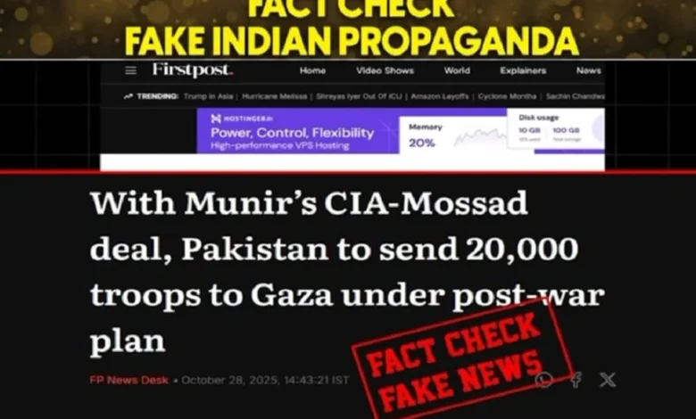 وزارت اطلاعات و نشریات پاکستان نے ایک بار پھر بھارتی میڈیا کی جھوٹ اور پروپیگنڈا سازشوں کا پردہ چاک کیا ہے، جس میں بھارتی جریدے "فرسٹ پوسٹ” نے ایک بے بنیاد اور گمراہ کن رپورٹ شائع کی۔ بھارتی جریدے نے دعویٰ کیا کہ پاکستان کی عسکری قیادت نے سی آئی اے اور موساد کے ساتھ ایک معاہدہ کیا ہے، جس کے تحت 20 ہزار پاکستانی فوجی غزہ بھیجے جائیں گے۔ وزارت اطلاعات و نشریات پاکستان نے اس جھوٹے دعوے کو سختی سے مسترد کرتے ہوئے کہا کہ اس میں کوئی حقیقت نہیں ہے۔