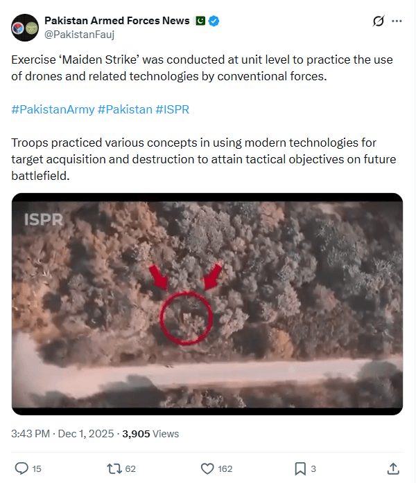 پاکستان آرمی کی خصوصی ڈرون وارفیئر یونٹس نے رواں ماہ ایکسرسائز “میڈن اسٹرائیک” کا انعقاد کیا، جس کا مقصد روایتی فورسز میں FPV ڈرونز کے مؤثر اور عملی استعمال کی مہارت کو مزید بہتر بنانا تھا۔