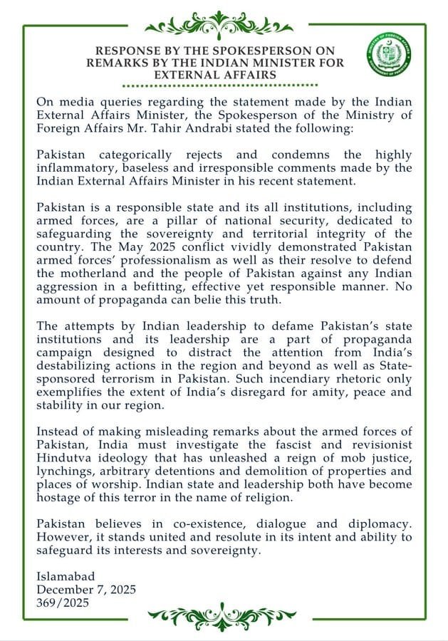 پاکستان نے اتوار کے روز بھارتی وزیرِ خارجہ ڈاکٹر ایس جے شنکر کے پاکستان کی مسلح افواج سے متعلق ’انتہائی اشتعال انگیز، بے بنیاد اور غیر ذمہ دارانہ‘ بیانات کی شدید مذمت کرتے ہوئے انہیں گمراہ کن اور حقائق سے دور قرار دیا۔ دفتر خارجہ کی جانب سے جاری کردہ ایک بیان میں کہا گیا کہ بھارت کی قیادت کا یہ طرز عمل پاکستان کے داخلی معاملات میں مداخلت اور خطے میں امن و استحکام کے لیے ایک سنگین خطرہ ہے۔