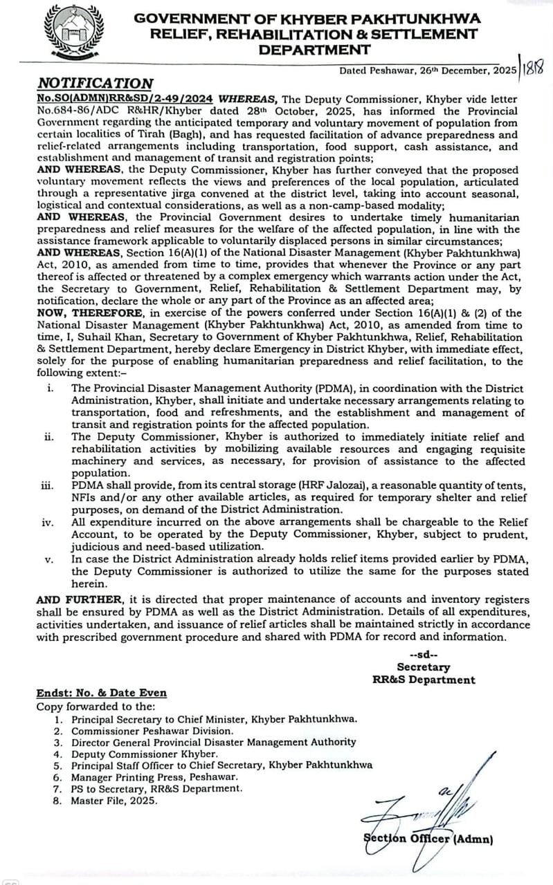 یہ معاملہ اس وقت مزید توجہ کا مرکز بن گیا جب کے پی حکومت کا 26 دسمبر 2025 کا ایک سرکاری خط منظرِ عام پر آیا، جس کی بنیاد پر وادی تیراہ سے آبادی نے علاقہ خالی کیا۔