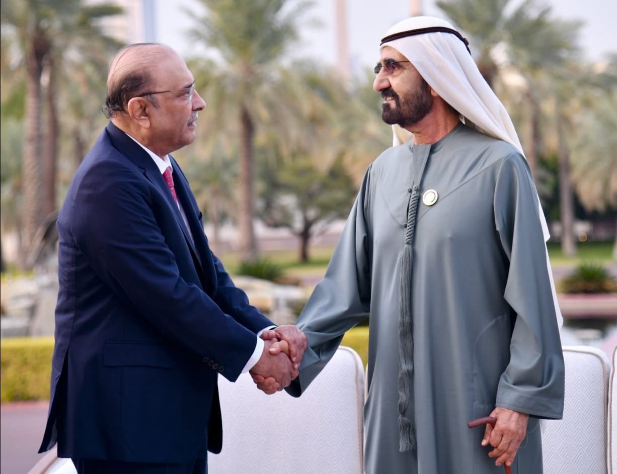 دبئی: صدرِ مملکت آصف علی زرداری نے دبئی کے زبیل پیلس میں متحدہ عرب امارات کے نائب صدر، وزیراعظم اور دبئی کے حکمران شیخ محمد بن راشد المکتوم سے اہم ملاقات کی۔ ملاقات میں پاکستان اور متحدہ عرب امارات کے درمیان دوطرفہ تعلقات کو مزید فروغ دینے، بالخصوص تجارت، سرمایہ کاری، لاجسٹکس، انفراسٹرکچر اور ٹیکنالوجی کے شعبوں میں تعاون بڑھانے پر تفصیلی تبادلۂ خیال کیا گیا۔