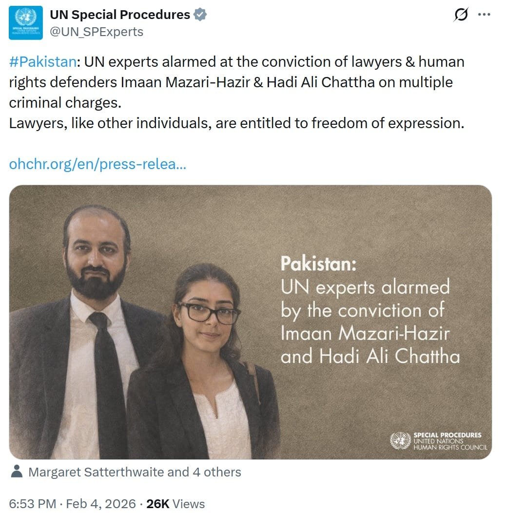 انسانی حقوق پر اقوام متحدہ کے ماہرین نے پاکستان میں معروف انسانی حقوق کی کارکن اور وکیل ایمان مزاری حاضر اور ان کے شوہر وکیل ہادی علی چٹھہ کو فوجداری الزامات کے تحت طویل قید کی سزائیں سنائے جانے پر گہری تشویش کا اظہار کیا ہے۔ ماہرین کا کہنا ہے کہ دونوں کو آزادی اظہار کے بنیادی حق سے فائدہ اٹھانے پر نشانہ بنایا گیا، جو بین الاقوامی انسانی حقوق کے معیارات کے منافی ہے۔