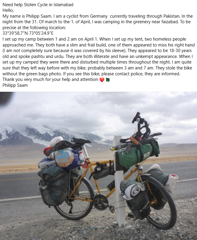 پاکستان کی سیاحت پر آئے جرمن سیاح فلپ سام کی سائیکل اسلام آباد میں چوری ہو گئی، جس کے بعد پولیس نے واقعے کی تحقیقات شروع کر دی ہیں۔ سیاح نے امید ظاہر کی ہے کہ ان کی سائیکل جلد برآمد ہو جائے گی تاکہ وہ اپنا سفر مکمل کر سکیں۔